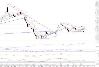 S&P 500: Looks like it is going to challenge the downtrend line again. At Friday's (6 Nov 2009) closing, I don't see the possibility of a successful break yet. The index should built a base a current level so that the challenge can be successful.